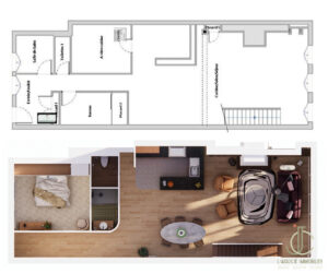A 2 pas du marché central et 3 minutes de place Stanislas, voici 106m2 développés en dernier étage et sur 2 niveaux d'habitation, avec cuisine ouverte sur un vaste espace de vie - avec cheminée- et avec une double hauteur sous plafond... ça fait rêver !